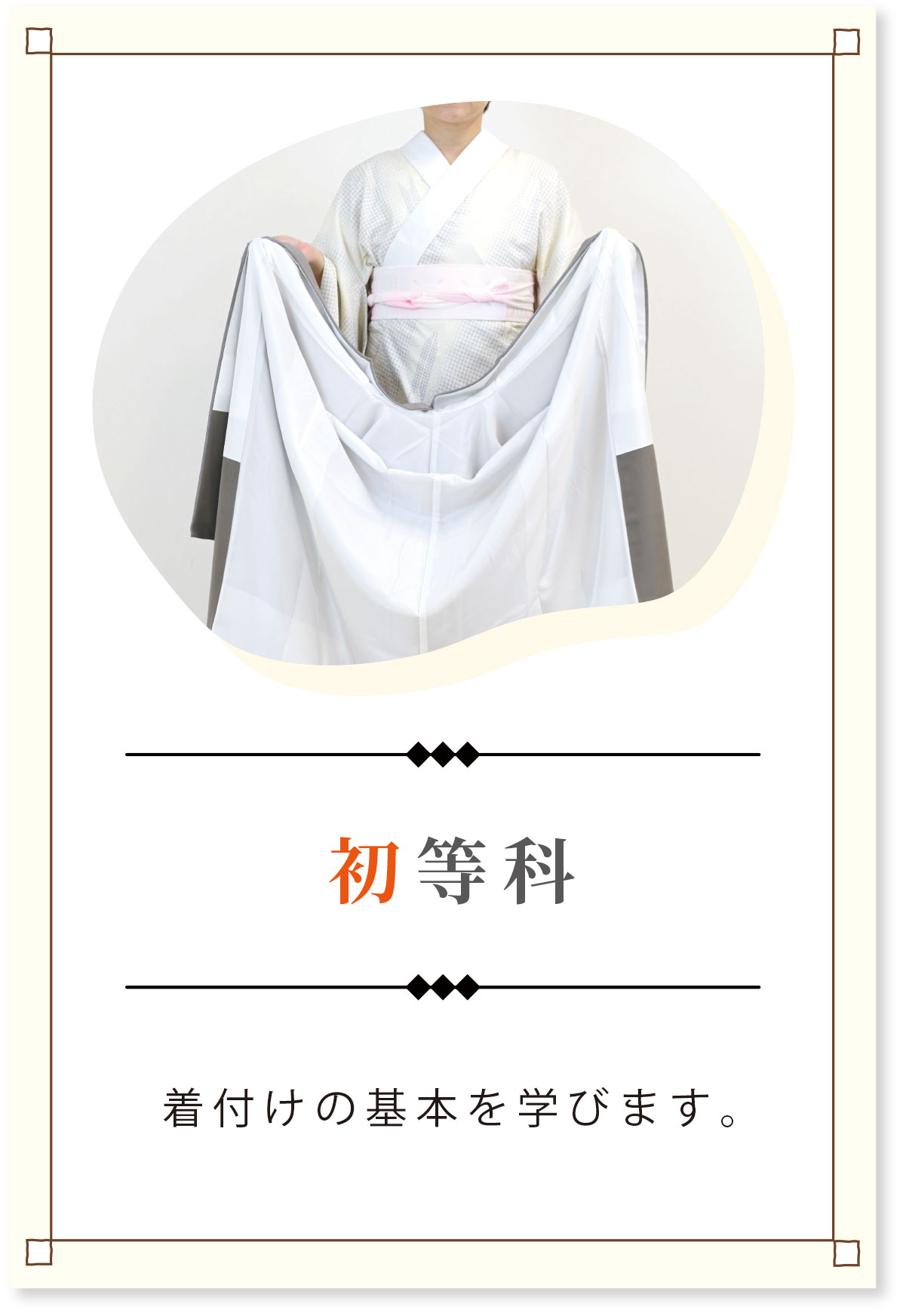 初等科は、初心者の方に着物の魅力を知って頂く為の第一歩として、どなたでも気軽に体験できるように開催しております。普段着の着付けから正装用の帯結びまで、やさしく分かりやすい指導で、受講後には着物の初歩的な知識も身に付きます。。